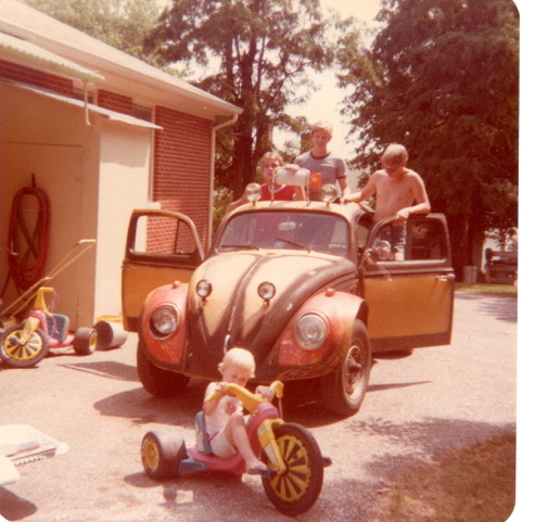 The ugly Bug, parked at the McDonalds’ house. In the car (l to r) are me, Ben Hancock, and Don. Justin McDonald is pedaling the Big Wheel.